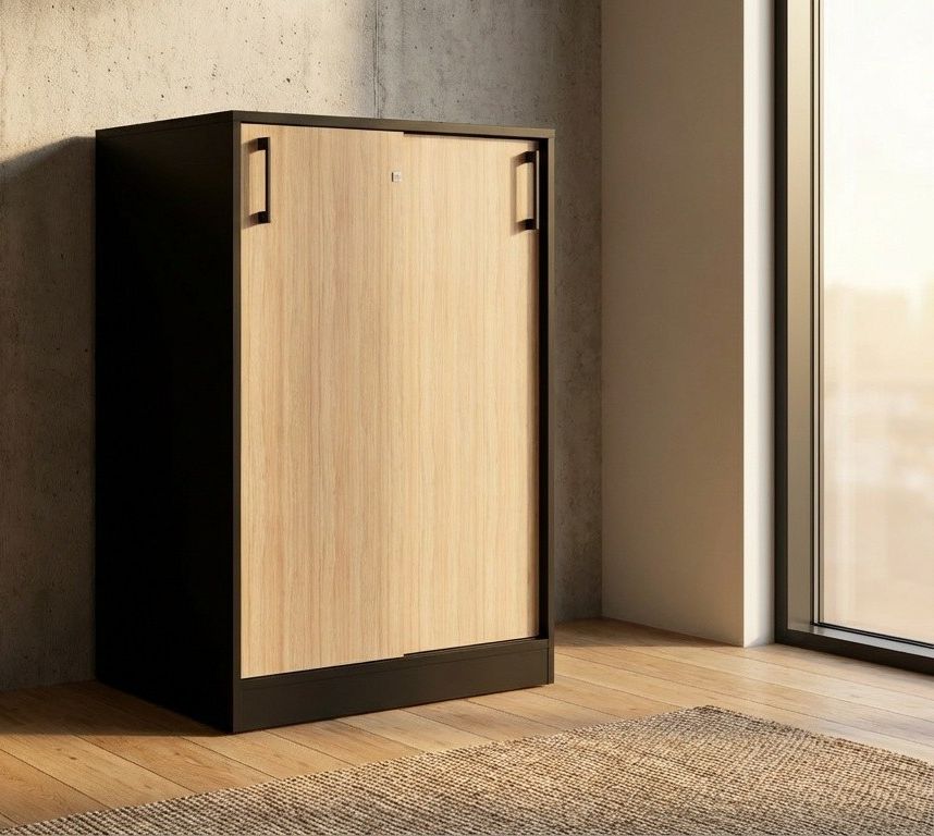 Praktisk låsbart skap med skyvedører i lys grå med bøkedører. Skapet kan leveres i flere farger hvor man kan kombinere med en farge på skroget og en annen på dørene. Sort farge er noe dyrere en andre farger. Dørende kan åpnes fra begge sider og utnytter plassen på kontoret.